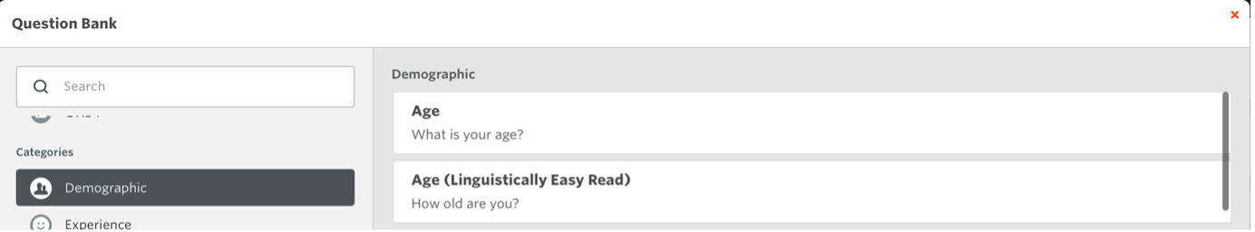 Question Bank questions that have a linguistically Easy Read version appear in the Question Bank alongside the original option. For instance, both ‘Age’ and ‘Age (Linguistically Easy Read)’ are stored in the Demographic category.