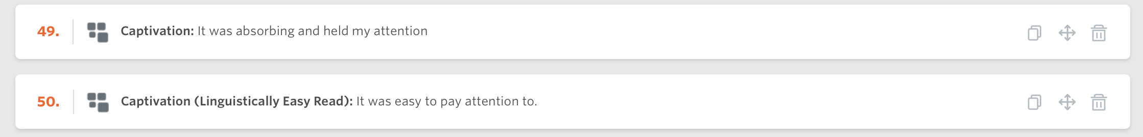 In the public survey of the linguistically Easy Read templates, any dimension or Question Bank question in the original template that has a linguistically Easy Read version available will have been replaced by the LER question.